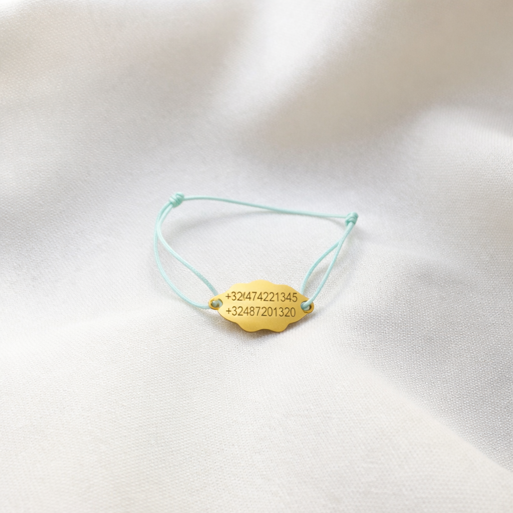 Vous pouvez graver UNIQUEMENT deux numéros de téléphone avec leurs préfixes, que des chiffres et pas de lettres. Il n’est pas possible de graver le prénom de l’enfant, pourquoi? Afin d’éviter qu’il ne prenne trop confiance et suive une personne malveillante qui connaît son prénom.
