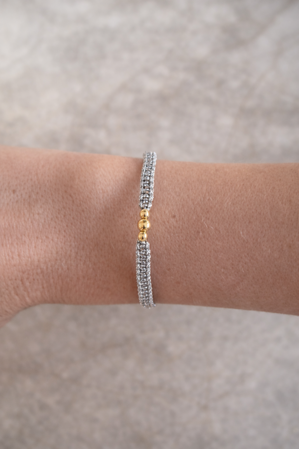 Bracelet tressé à la main en Belgique avec du fil de Jade argenté